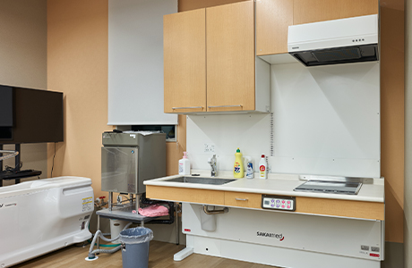 そのため、OTから希望のあった、ADLキッチンや昇降式洗面ユニットを導入し、ご自宅の環境にできるだけ近づけたADL訓練ができるようにしました。特にキッチンは、ご自宅に戻った時の環境を想定してトレーニングする上で非常に役立っています。患者ご自身も、慣れた環境に近い場所で訓練することで自信がつくという効果があります。