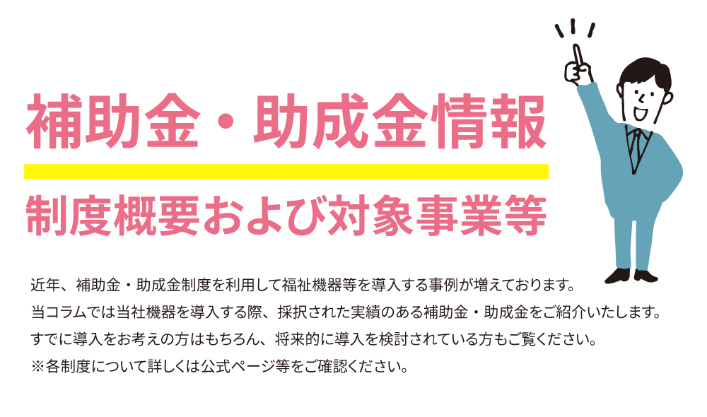 | 対象事業 | (福祉機器の整備の場合)特殊浴槽、見守り支援システム(ナースコール除く)、介護ロボット(移乗介助、移動支援)、介護リフト、モジュール型車いす |